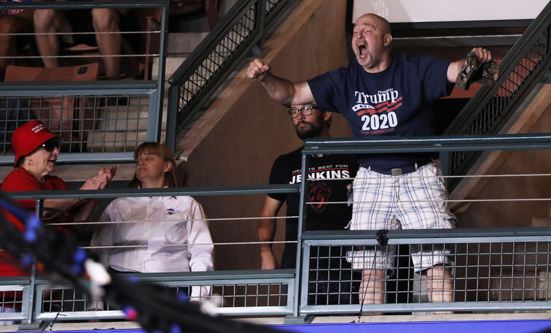 © Reuters. A Trump supporter cheers as a small group of protesters are removed as U.S. President Donald Trump rallies with supporters in ManchesterBy Steve Holland